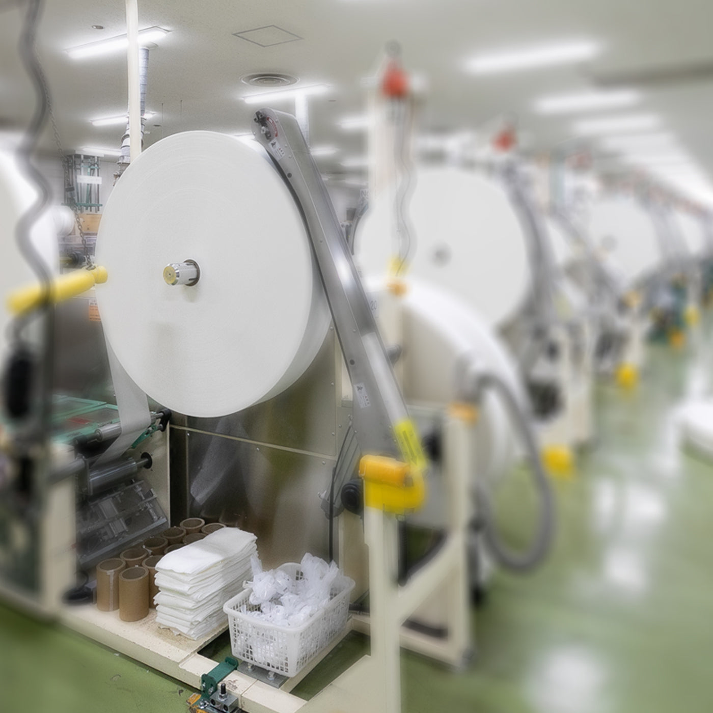 当社の製品は全てが国内生産品です。隣接した王子キノクロスで生産された不織布原反を同一敷地内で移送・搬入し、徹底した衛生管理のもと、自社工場で製品に加工しています。